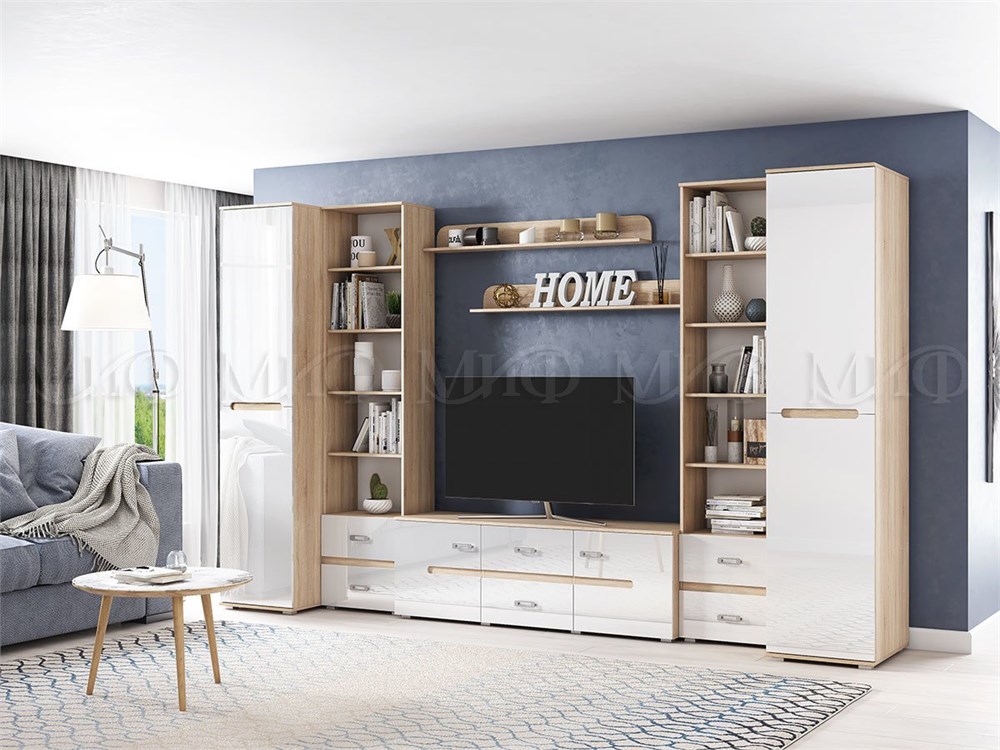 Модульная гостиная «Ким» выполнена в одном стиле и цветовой гамме со спальней «Ким», что позволяет подобрать мебель для квартиры любой площади. Отличается белыми глянцевыми фасадами.